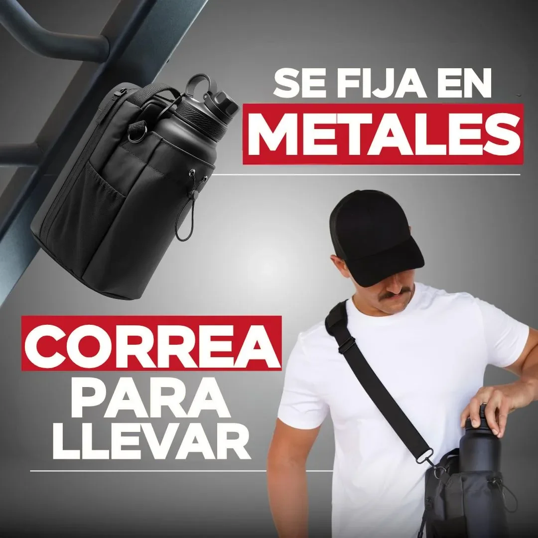 Tiene una cuerda elástica ajustable para llevar tu botella de agua desde 600ml hasta 1.9L. Puedes pegarla en las máquinas del gym o cualquier material de acero.